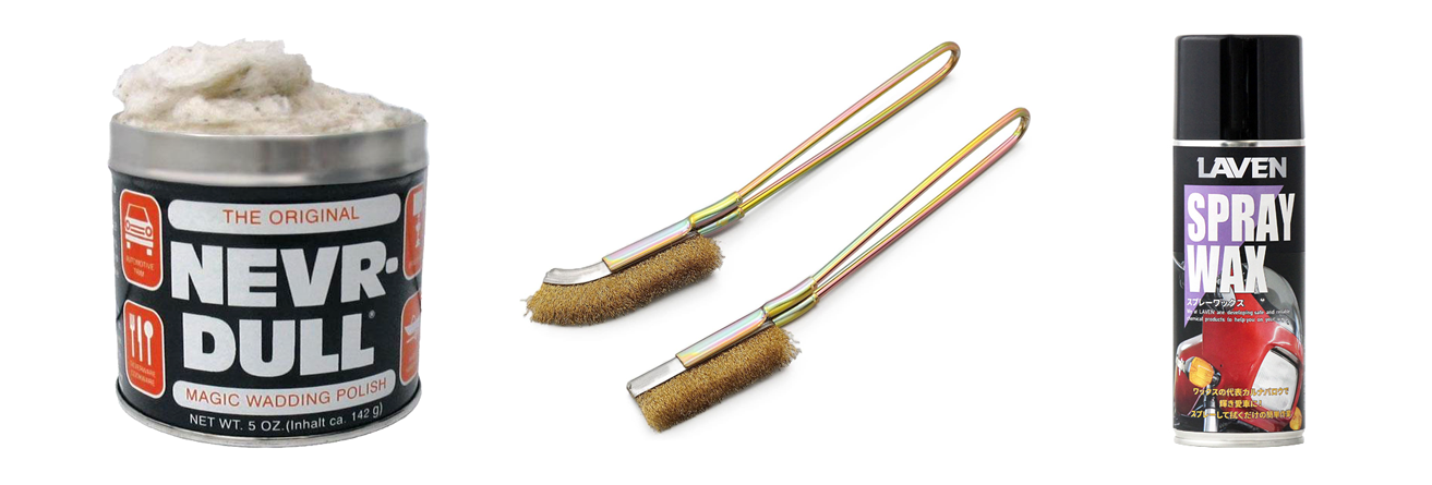 ざっと各部をチェックすると、主な錆の個所は、Fバスケットステー、スポーク、リム、ステム、シートポスト。全部きれいに落とすと、それだけで別物に見えてくる。錆落としにはケミカルの“ネバダル”が非常に有効。強い錆にはさらに真鍮ブラシを使う。全体の汚れ落としと艶出しには、モト・ギャルソンでもよく使うバイクワックスが効果的だ。倉庫の奥に古いオフロードスタンドがぶん投げてあったので、これを椅子として使ったが、なかなかあんばいがいい。