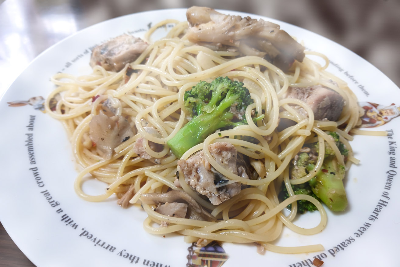 写真は、サバと舞茸とブロッコリーを材料にし、塩、コショウと豆板醤で味付けをしたパスタである。簡単に作れて栄養もあるし、サバ缶一個百七十九円なので、財布にも優しいのである。