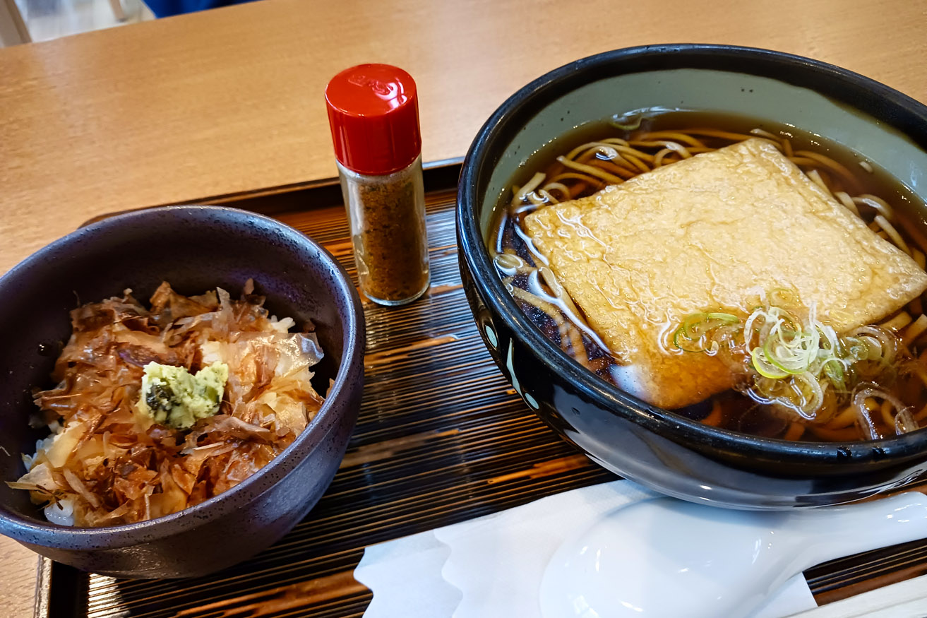 温泉から上がると食堂へ直行。客は三組しかいない。まずは食券を買ってスタッフへ渡す。女房はきつねそばとわさび丼セット、私は豚の角煮丼をチョイス。