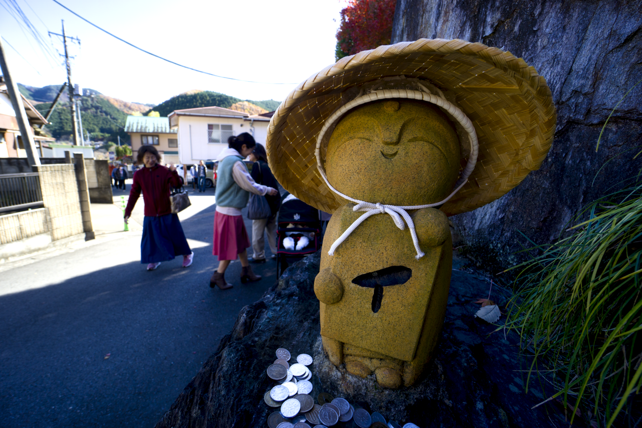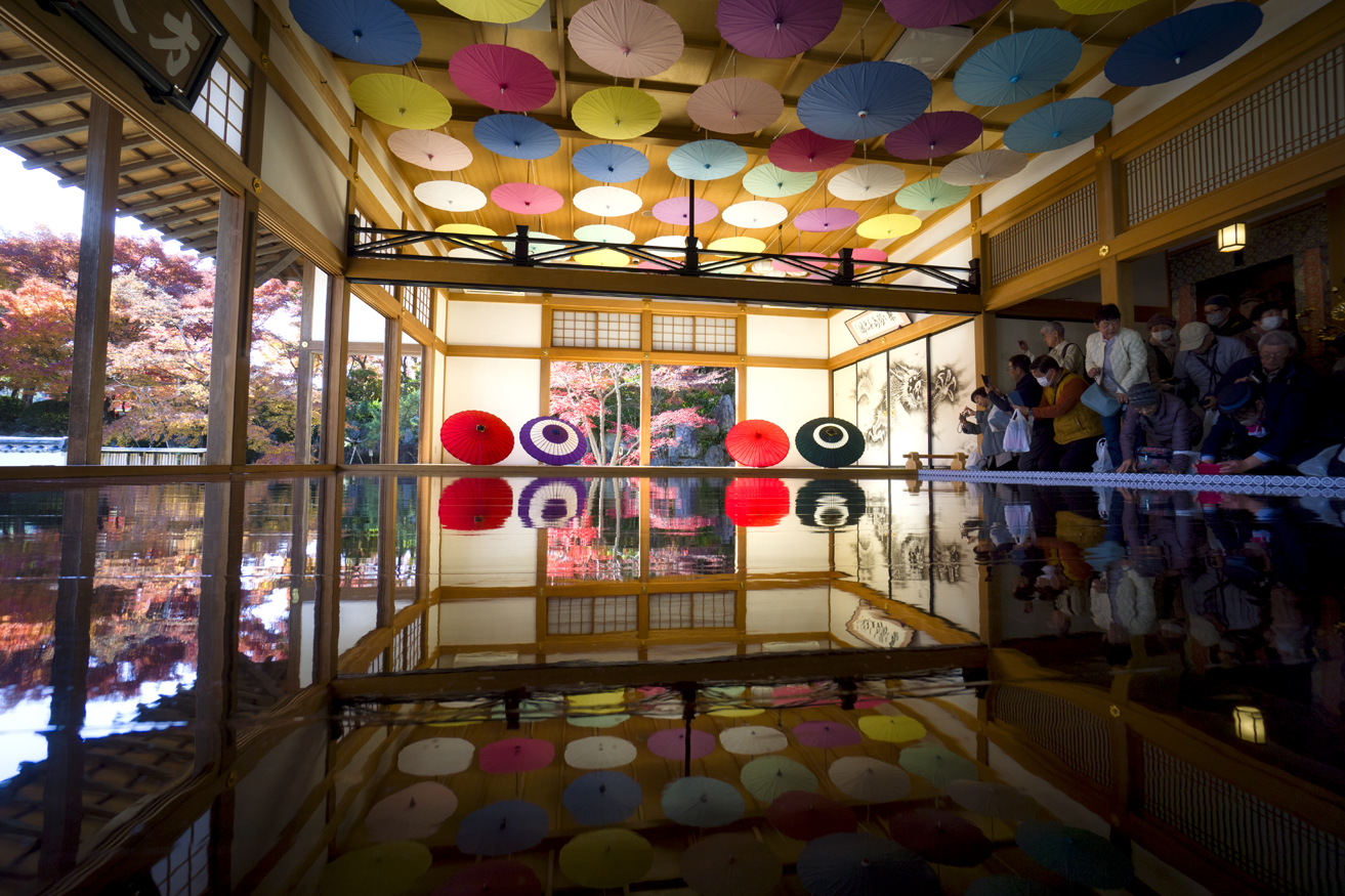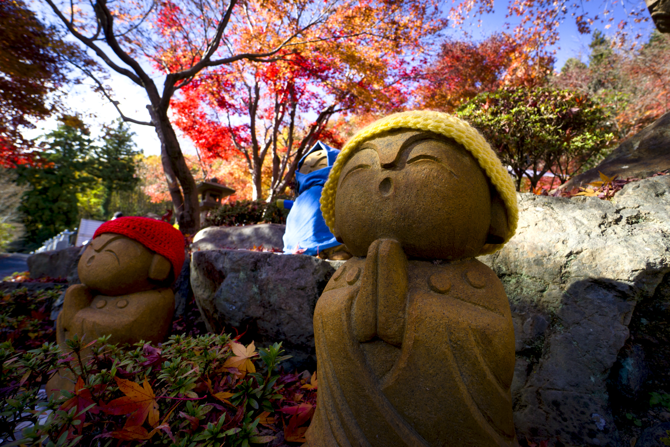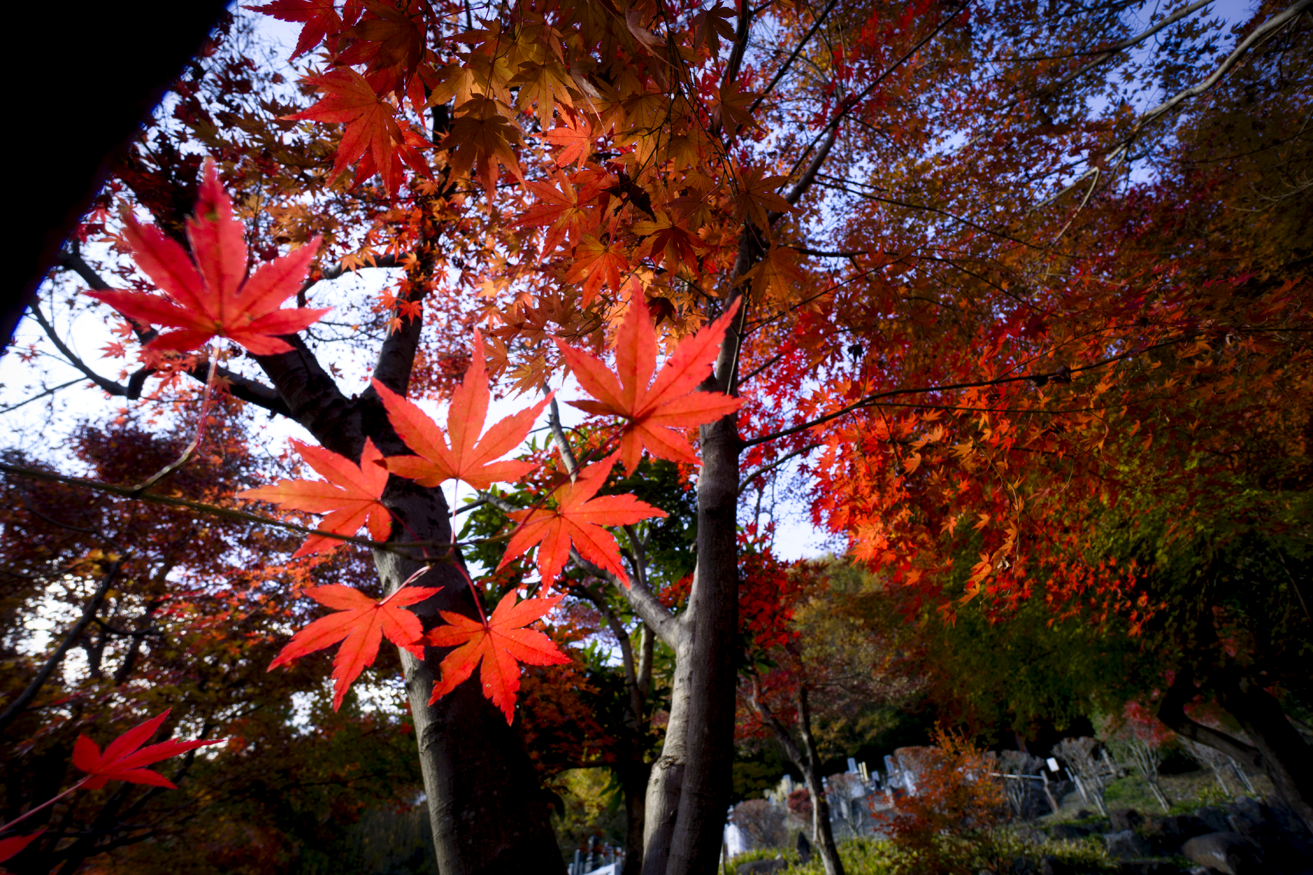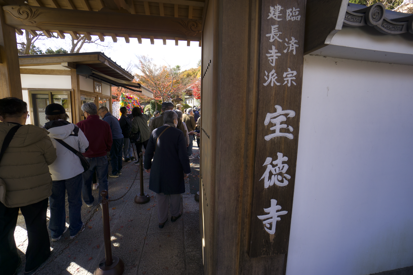 宝徳寺の紅葉はぎりぎりセーフのようだ。境内にあるモミジの発色はとても見事で、好天に助けられ目にも眩しいほど。おまけにシーズンとあって来場者が多く、目玉の“リフレクション”では場所取り合戦が勃発、レッドカーペットの上で床に伏せ、スマホを覗き込みながらシャターを切る姿が延々と続く。持参したα6000の液晶は、上下に角度を変えられるので、床に伏せなくても楽にローアングルが決められる。