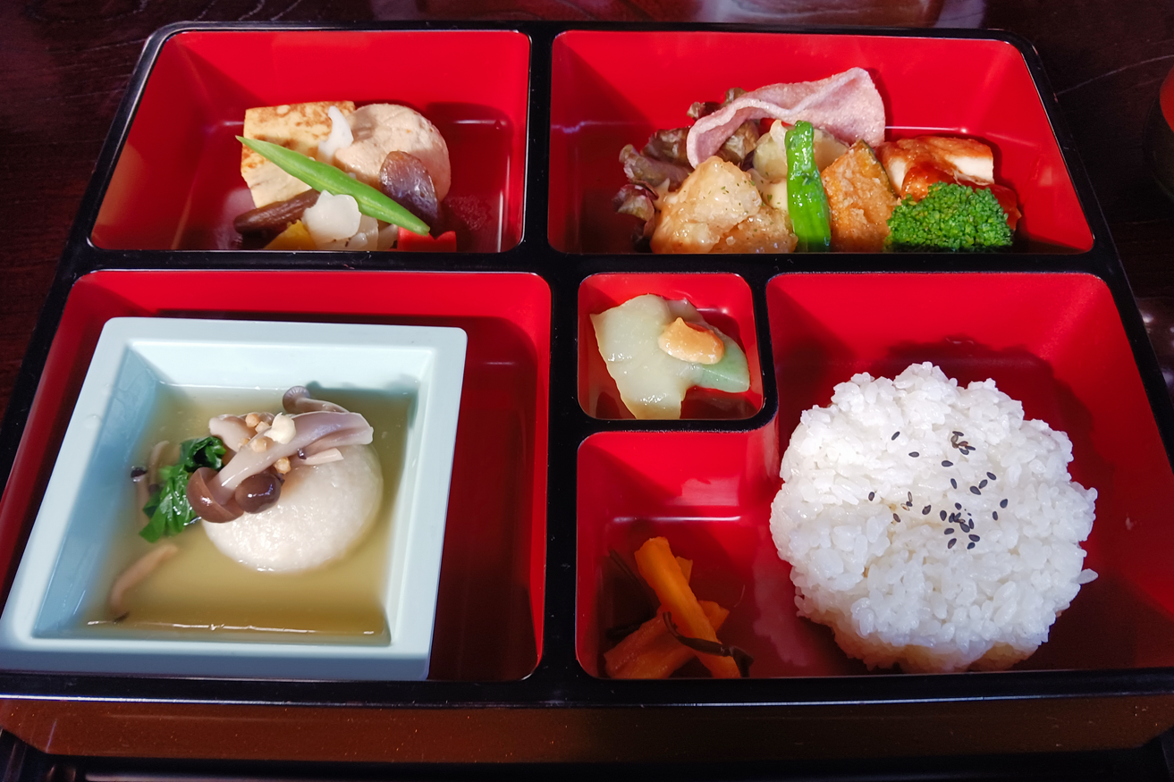 そうするうちに味噌汁と弁当箱が運ばれてきた。蓋を取ると四つ切り箱。松花堂弁当である。案の定、量が少ない。が、いただくと、これがうまい。こんにゃくの刺身は無論のこと、煮物、鳥の照り焼きも言うことなし。ご飯にいたっては冷たくても驚くほどおいしいのだ。これぞ老舗の味か。